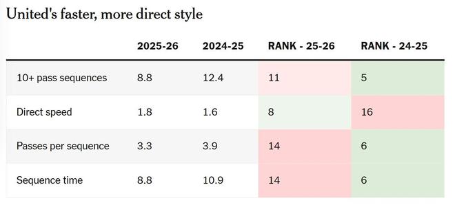 门将位置的变化还不止于此。尽管样本量仍然相对较小,但曼联门将成功拦截传中的百分比跃升了超过一半。拉门斯对高空球的控制力极强的出击,迄今已赢得了老特拉福德场内球迷的广泛好评,人们希望他能继续保持。全场更快、更直接的打法拉门斯的长传不应掩盖曼联本赛季在阿莫林带领下整体打法也变得更为直接的事实。关于英超整体风格正回归更加强硬和混乱的讨论很多,但即使在这样的背景下,曼联在某些数据指标上依然突出。例如,阿莫林的球队尝试了总长传次数第三多,而上赛季他们仅处于联赛平均水平左右。上赛季(2024-25赛季)联赛中进攻速度第五慢的曼联,如今是第八快的。曼联每次控球的传球次数以及包含10次或以上传球的控球序列数量已显著下降。