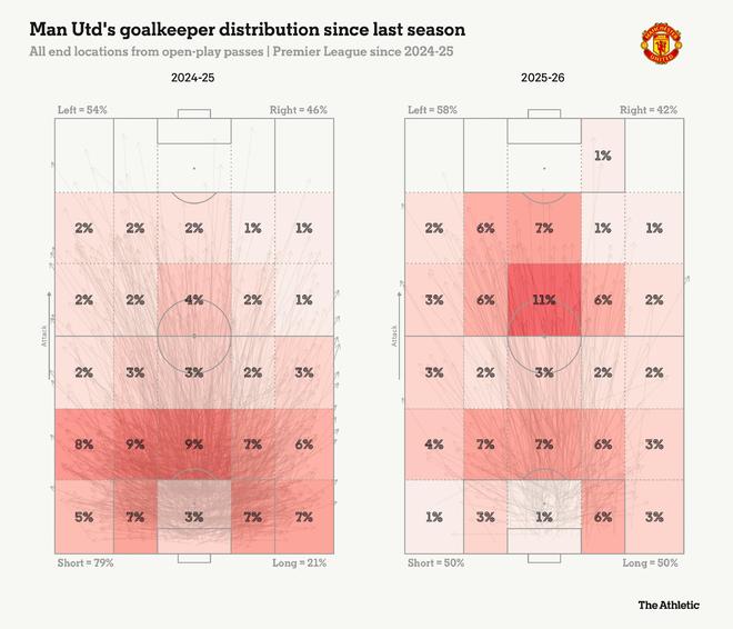 英超赛季已近四分之一,曼联凭借一波三连胜,目前排名第六,仅落后前四名一分。这无疑是一个良好的开局,尤其在一个多月前客场负于布伦特福德之后,情况远好于许多人的预期。那天,阿莫林还在思考他执教开局六场比赛就输掉三场的问题,并准备迎接又一轮关于他3-4-3阵型的争论。“情况总是如此。我们赢球时,没人提阵型。我们输球时,问题就出在阵型,”他当时说道。三场胜利之后,对其阵型的批评已悄然平息,不得不承认他说得有道理。阿莫林一直坚持他不会改变自己的3-4-3体系——或者说,至少他只会在自己认为合适的时候改变——并且他信守了这一承诺。然而,当你将导致上赛季惨淡的第15名排名的那些表现,与曼联本赛季迄今为止所呈现的内容相比较时,可以清楚地看到,在阿莫林偏爱的体系框架内,比赛的侧重点和风格细节已经发生了明显的变化。在此,《The Athletic》深入分析了曼联本赛季前九场英超比赛与上赛季的数据对比,以揭示阿莫里姆在新赛季开局背后所隐藏的风格差异。拉门斯的长传让我们从一个明显的改变开始。门将的长距离开球传球是本赛季曼联比赛风格最显著的不同之处,尤其是在拉门斯在对阵桑德兰的比赛中完成首秀之后。拉门斯在那场比赛中送出了37次长传,随后在安菲尔德更是有多达45次,仅比利物浦全队球员的长传尝试总数少两次。上一周末对阵布莱顿的比赛中,拉门斯又送出了32次长传。在巴因迪尔首发时,这种情况也已出现(其传球中有47%是长传),但拉门斯的启用将这一战术推向了新的高度。曼联场均23.2次门将长传是英超最多的——超过了在过去两个赛季一直领跑此项数据的埃弗顿——并且比阿莫林球队上赛季的长传数量增加了76%。不过,这一改变的种子在上个赛季就已埋下。今年早些时候,阿莫林曾指示奥纳纳,如果他觉得从后场组织进攻风险过高,可以选择长传。尽管如此,上赛季曼联门将绝大多数时间还是以短传为主。本赛季,短传和长传的比例是均衡的五五开。而且随着拉门斯的到来,这一趋势似乎只朝着一个方向发展。
