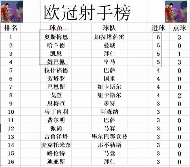 射手榜方面,奥斯梅恩缺阵,还是6球位列榜首,哈兰德,凯恩和姆巴佩5球并列第2。拉什福德,劳塔罗,巴恩斯和戈登4球并列第5。马丁内利,费尔明,麦克托米奈,略伦特等人3球刚好挤入前十。以上内容请关注首页JRS