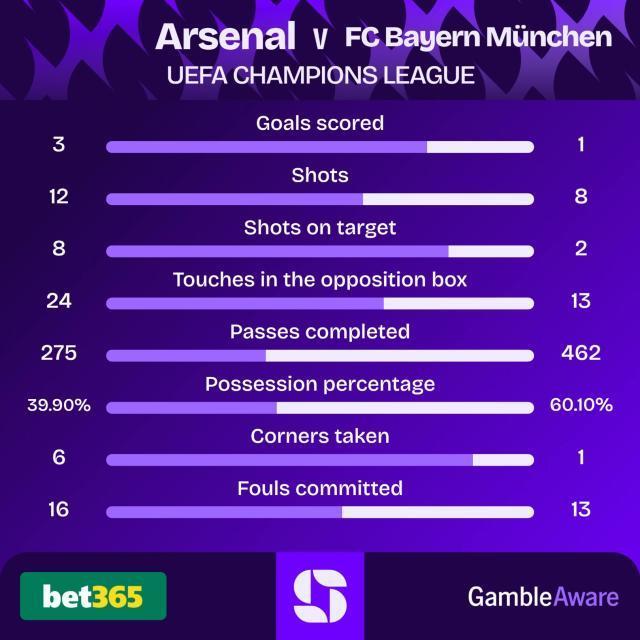 阿森纳首发:拉亚/于里恩·廷伯(81'本·怀特),萨利巴,克里斯蒂安·莫斯克拉,刘易斯-斯凯利(68'卡拉菲奥里)/埃泽(81'厄德高),苏维门迪,赖斯/萨卡(68'马丁内利),梅里诺,特罗萨尔(38'马杜埃凯)拜仁慕尼黑首发:诺伊尔/斯塔尼希奇,于帕梅卡诺(82'金玟哉),若纳唐·塔,莱默(72'比朔夫)/基米希(81'戈雷茨卡),亚历山大·帕夫洛维奇/奥利塞,伦纳特·卡尔(82'拉斐尔·格雷罗),格纳布里(72'尼古拉斯·杰克逊)/凯恩【数说】9-伦纳特·卡尔的进球打破了阿尔特塔治下的阿森纳在欧冠小组赛/联赛阶段主场的不丢球金身,让连续不丢球场次定格在9场。1-今夏加盟阿森纳的新援马杜埃凯打入了自己代表枪手在各项赛事中的首个进球。50-马丁内利已经在50场各项赛事的比赛中帮助阿森纳进球。这50场比赛阿森纳保持不败。5-阿森纳在欧冠的联赛阶段取得开局5连胜,独自领跑积分榜,也是唯一一支仍然保持全胜的球队。这是阿森纳自2005-06赛季以来再度欧冠开局5连胜。那个赛季他们最终闯入决赛。18-拜仁慕尼黑本赛季开局连续18场不败被阿森纳终结。
