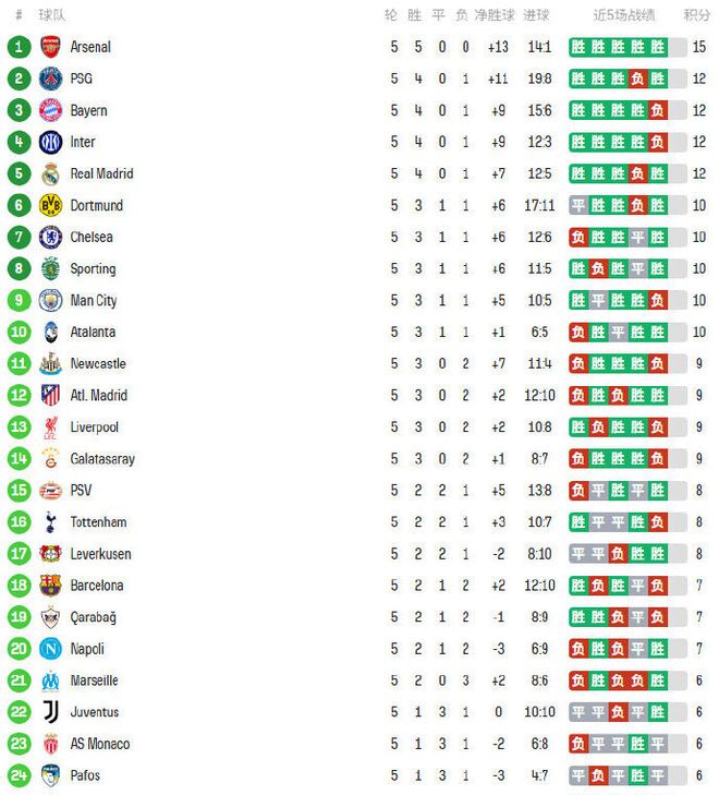 欧冠5轮后积分榜巨变阿森纳5连胜领跑2队遭首败利物浦巴萨陨落