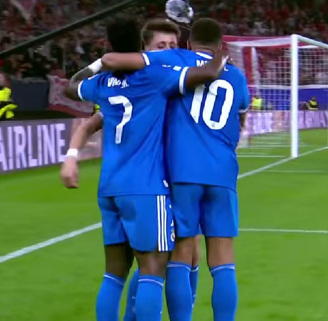 下半场开始后不久,奥林匹亚科斯早早就追回1球,把比分缩小为2-3。第60分钟,维尼休斯边路强行突破,随后横传到门前,姆巴佩跟上捅射破门,皇马再度把优势扩大为2球。尽管主队之后反扑再进1球,但是皇马还是顺利4-3拿到3分。