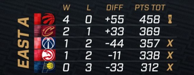 东部A组:猛龙4连胜提前晋级,步行者0胜3负提前出局。而因为后面东部C组的第2确定是3胜1负,所以奇才和老鹰就算是小组第2也会出局,因此A组悬念只剩下骑士了。骑士最后1场击败老鹰,3胜1负小组第2,有机会跟其他组的第2比净胜分。骑士如果输给老鹰,那肯定出局。