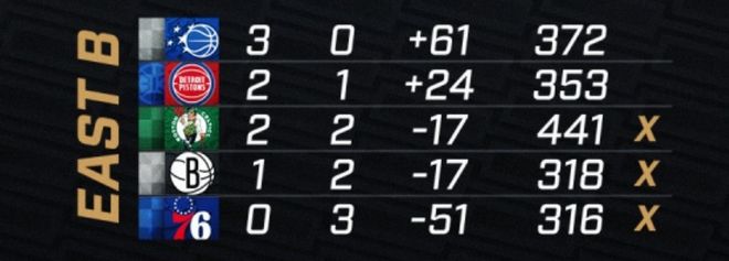 东部B组:凯尔特人、篮网、76人提前出局,魔术和活塞还有晋级希望。最后1轮魔术VS活塞,魔术赢球魔术第1晋级,活塞出局;活塞赢球活塞第1晋级,魔术3胜1负小组第2跟其他两组的第2比净胜分。