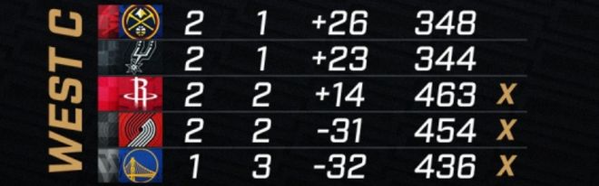 西部A组:雷霆太阳都是3胜0负,最后1场正面交手决出第1第2,第1晋级,第2将是3胜1负,与其他组第2比战绩。森林狼、国王、爵士出局。
