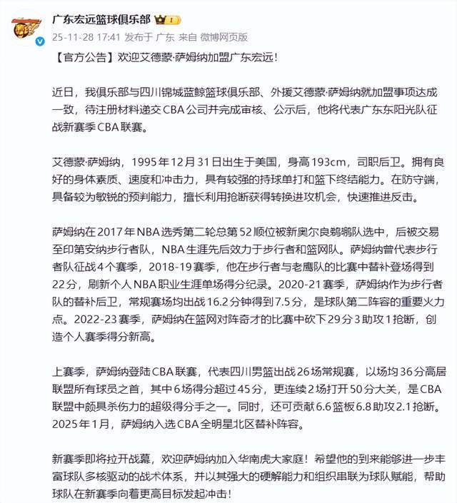 萨姆纳上赛季效力于四川男篮,他代表球队出战26场常规赛,场均36分。高居联盟之首,成为得分王,其中多达6场得分超过45分,更连续2场打开50分大关,是CBA联盟中颇具杀伤力的超级得分手之一。同时,还可贡献6.6篮板6.8助攻2.1抢断。2025年1月,萨姆纳入选CBA全明星北区替补阵容。如此勇猛之人,在四川男篮就有些埋没人才了,恰好四川男篮陷入欠薪风暴,广东男篮发起冲击,最终如愿拿到了萨姆纳的优先续约权,并且在11月28日下午完成了官宣,萨姆纳加盟广东男篮了。