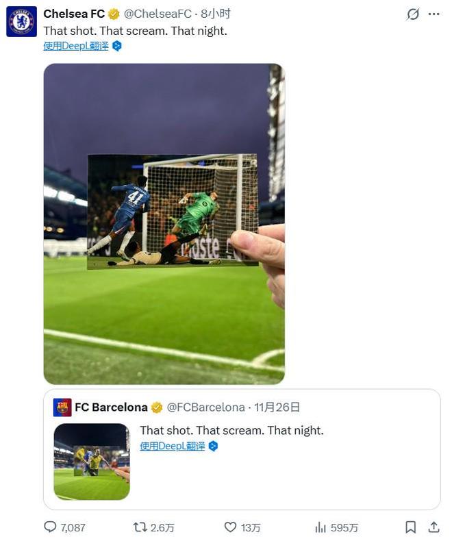 - 英超 | 巴萨赛前发小白当年绝杀照,切尔西赛后用埃斯特旺破门照回应
