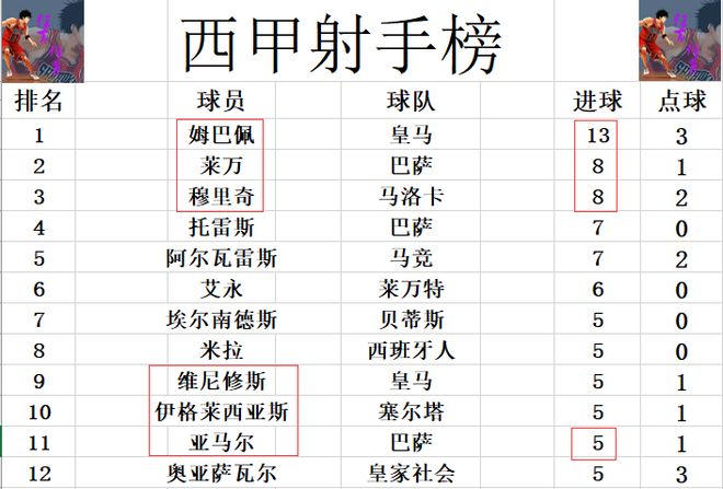 射手榜方面,姆巴佩13球稳居榜首,莱万今天只有一次助攻没有进球,被梅开二度的穆里奇追上,两人8球并列第2。托雷斯和阿尔瓦雷斯今天都是替补登场没有破门,7球并列第4。亚马尔传射建功,追上维尼修斯,奥亚萨瓦尔等人5球刚好挤入前十。以上内容请关注首页JRS