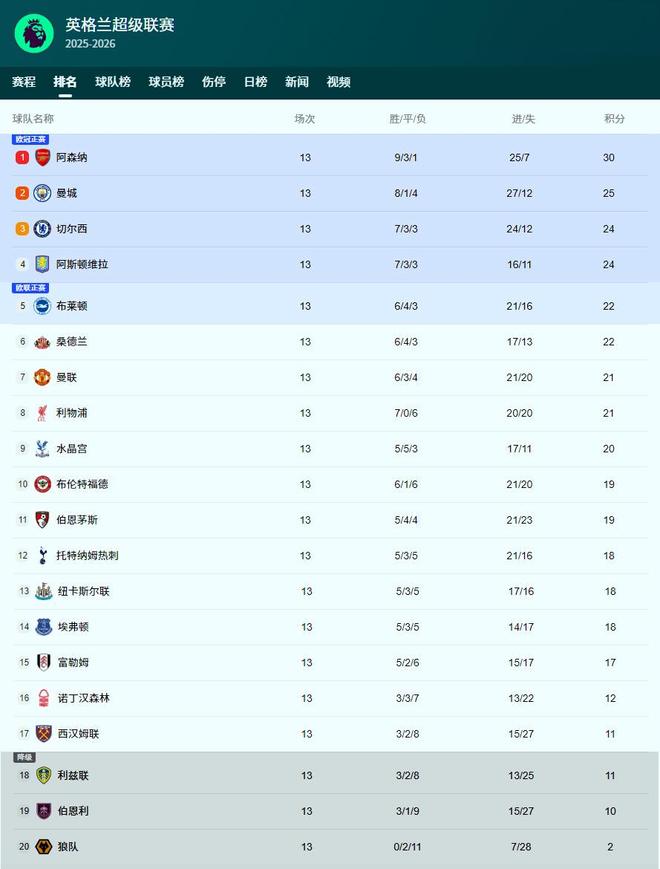 - 英超 | 英超最新积分榜:阿森纳战平蓝军5分领跑,曼联客场逆转攀升第7!