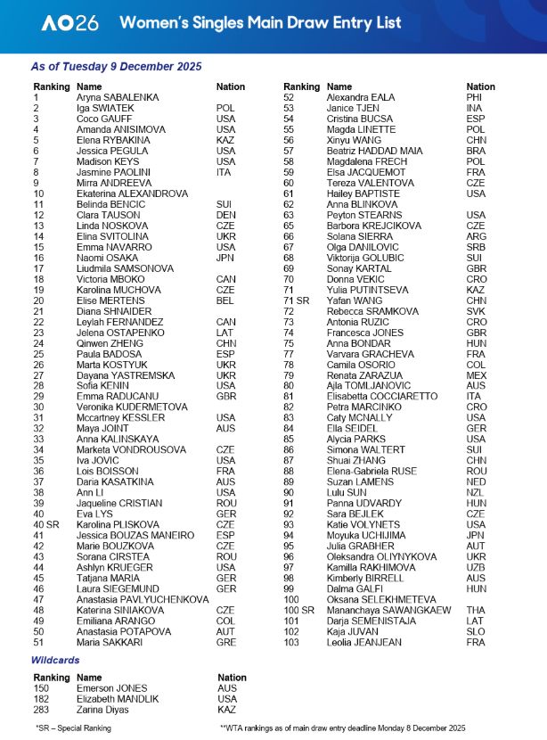 北京时间12月9日,澳大利亚网球公开赛官方公布2026澳网男、女单正赛入围名单。中国选手共有7人入围单打,女单4人,男单3人。本届赛事,爱奇艺体育将全程直播。