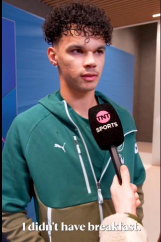 你今天早上吃了什么不一样的早餐吗?“我没吃早餐。”没有吗?没吃早餐就踢欧冠还进了你的第一个欧冠进球?“没有,就吃了一根香蕉,一些补充剂,还有一杯橙汁。”