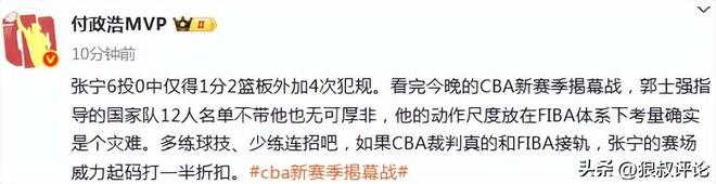 媒体人付政浩发文点评:“张宁6投0中仅得1分2篮板外加4次犯规。看完今晚的CBA新赛季揭幕战,郭士强指导的国家队12人名单不带他也无可厚非,他的动作尺度放在FIBA体系下考量确实是个灾难。多练球技、少练连招吧,如果CBA裁判真的和FIBA接轨,张宁的赛场威力起码打一半折扣。”赛后,潘江被问到张宁上半场得到0分的话题表示:“确实有点影响,中场休息的时候提到不要急躁,过早的犯规会影响后面的用人。”