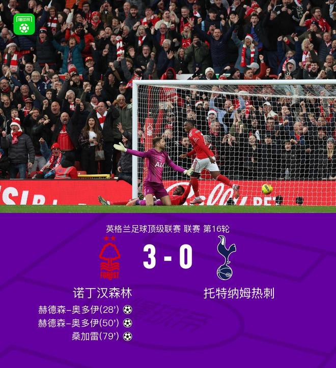 北京时间12月14日,英格兰足球超级联赛第16轮,诺丁汉森林坐镇主场迎战托特纳姆热刺。比赛中,桑加雷前场抢断格雷,助攻赫德森-奥多伊打空门得分。此后,桑加雷再次送出助攻,赫德逊-奥多伊吊射世界波打进第二球。比赛进入尾段,赫德森-奥多伊送出助攻,桑加雷不停射门得分。最终,诺丁汉森林以3比0战胜热刺,全取三分。关键事件
